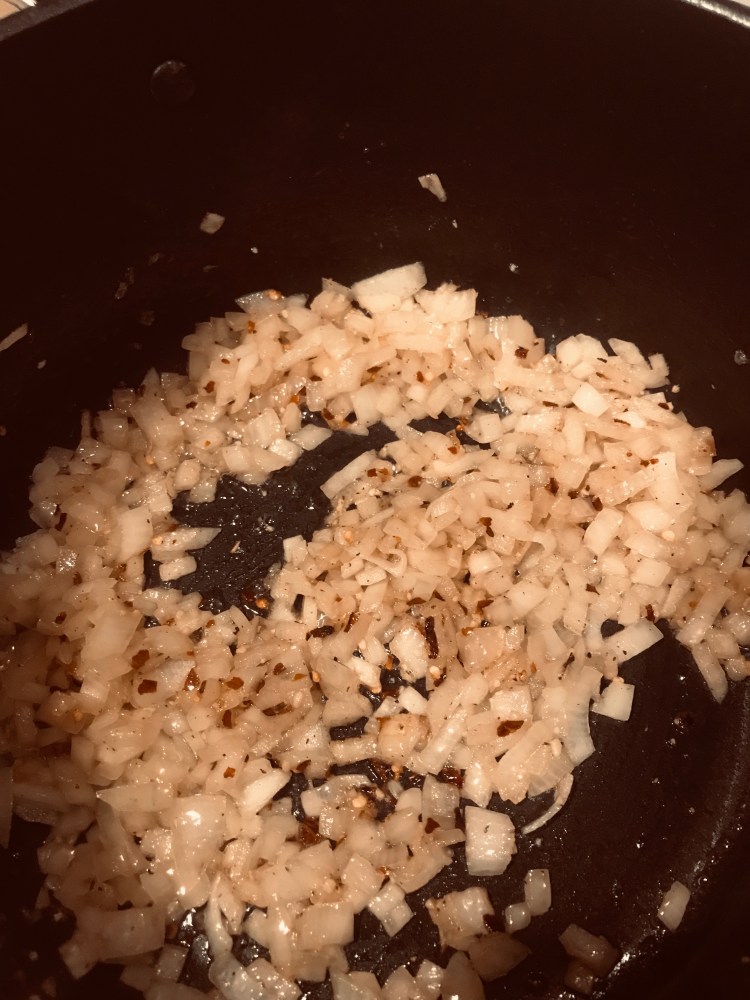- In a large pot or dutch oven, melt bacon fat, if using. Or add olive oil. Add diced onion and cook until yellow and translucent.