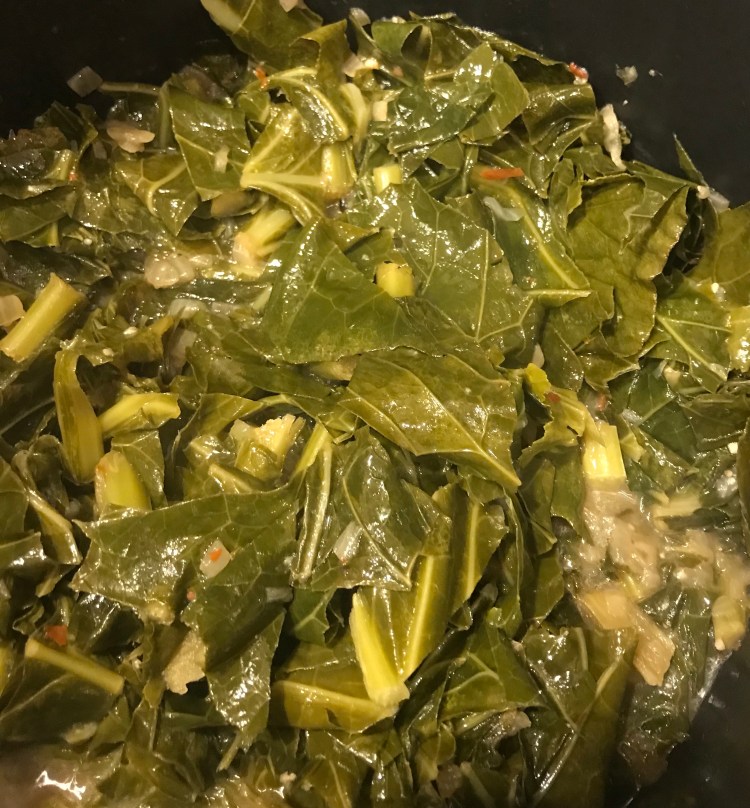 - 2 10oz bags precut and pre-washed collard greens. Rinsed.