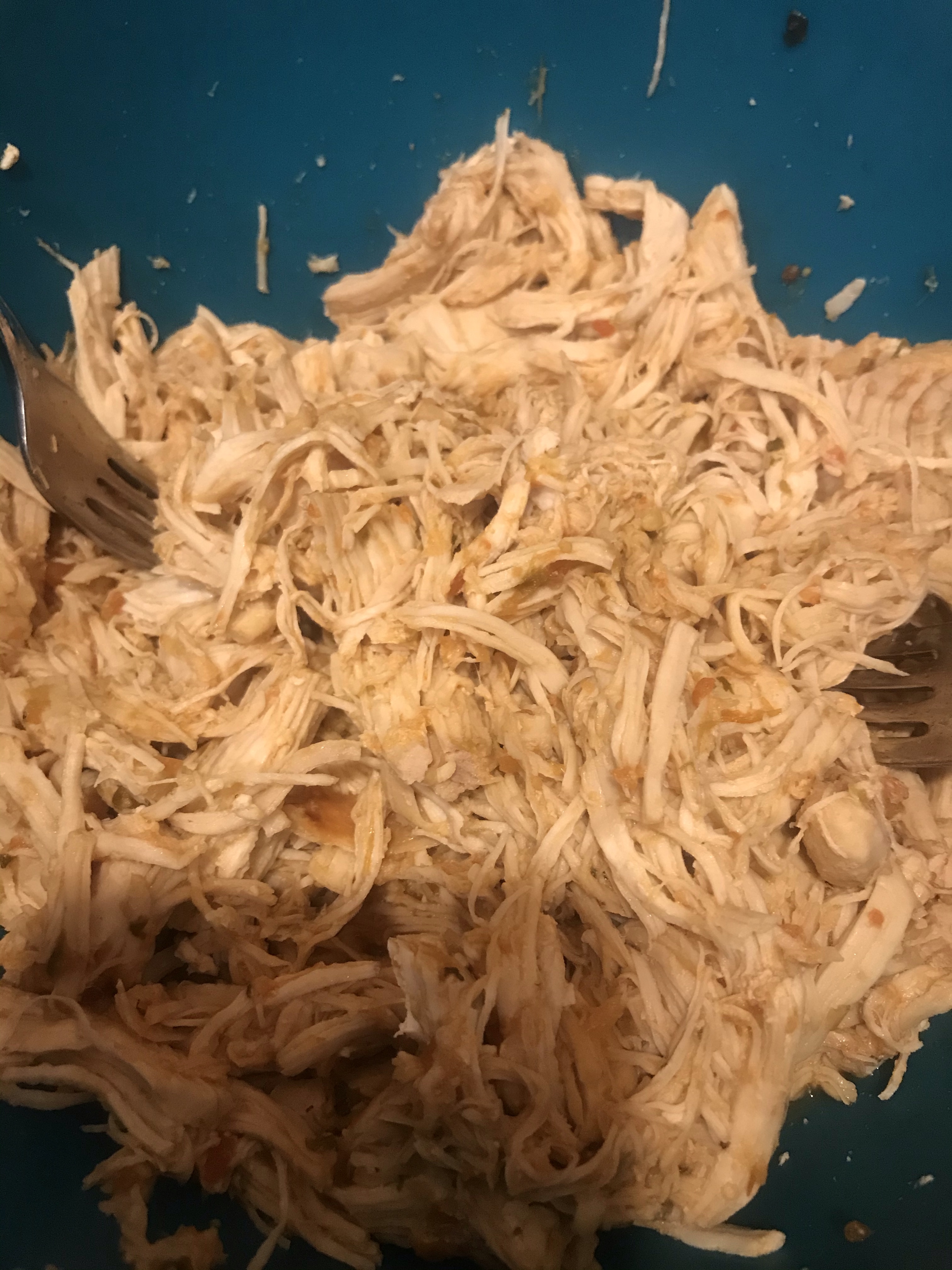 - cook chicken in salsa in one of two ways: simmer in salsa and a cup of water until fork tender (about 40 minutes) OR put chicken and salsa in an Instant Pot and pressure cook in high for 20 minutes with quick release.