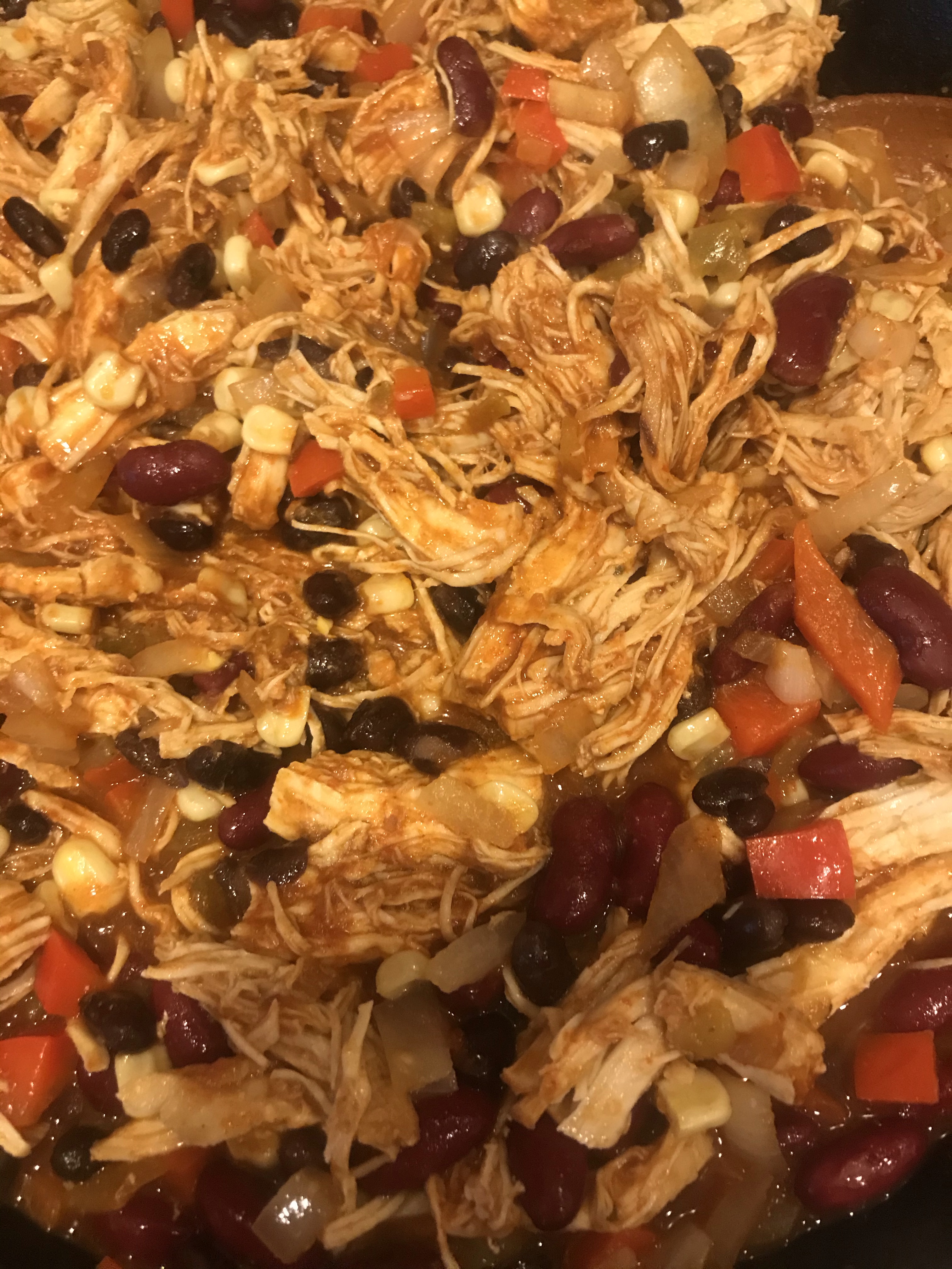 - Put olive oil in pan and heat to medium. Cook onions and bell pepper until soft. Add frozen corn. Cook until not frozen. Add chicken, beans, green chile, 2 cups of enchilada sauce, and mix well.