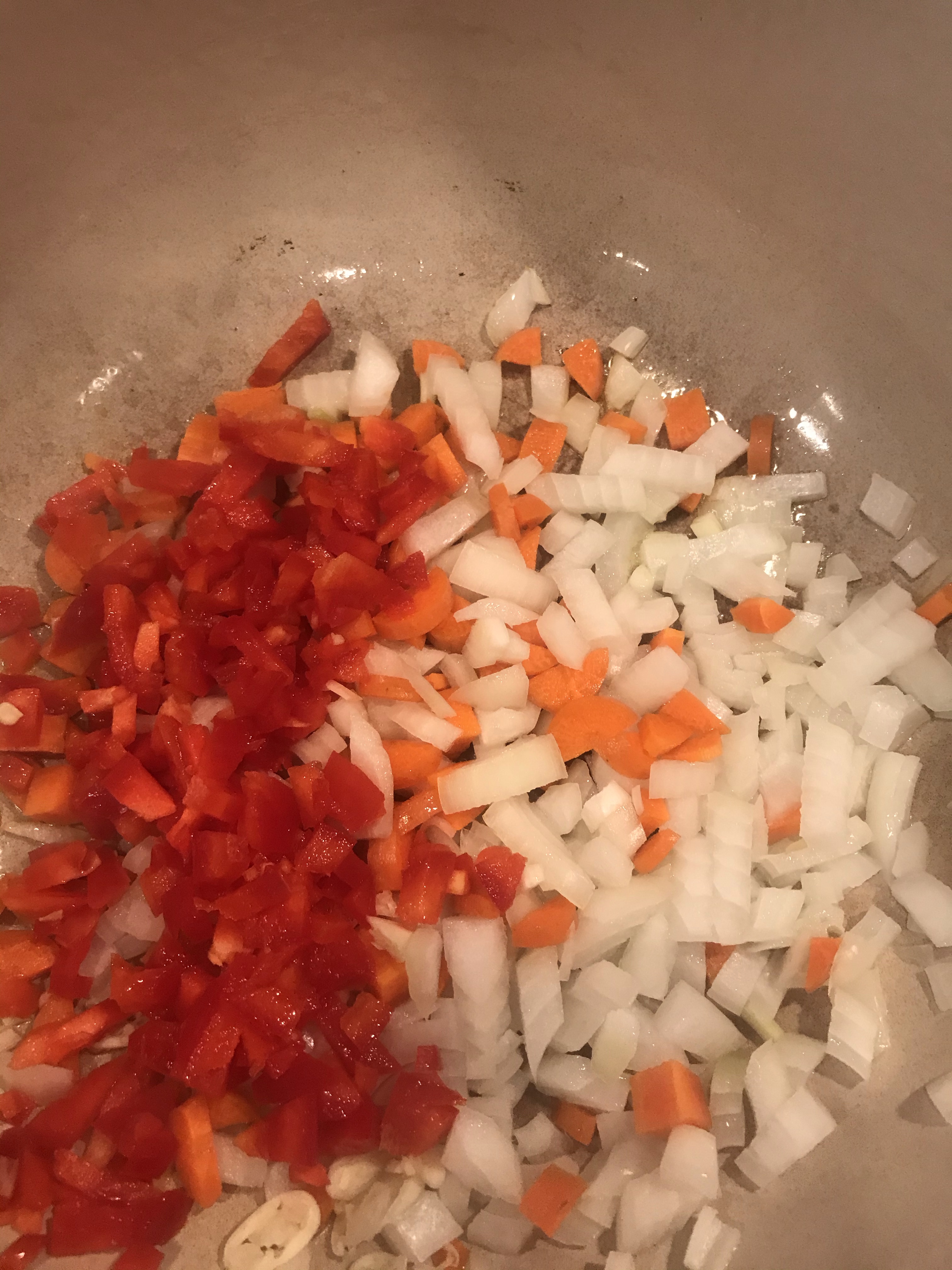 - Sauté onion, carrots, celery, diced bell pepper until soft and translucent. Add garlic and cook 30 seconds.