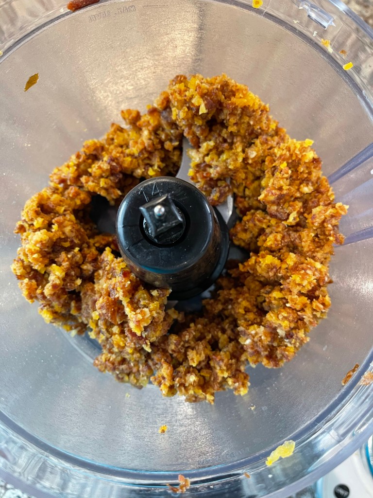 - Add nuts and freeze dried fruit if using and pulse until finely chopped but not into dust.