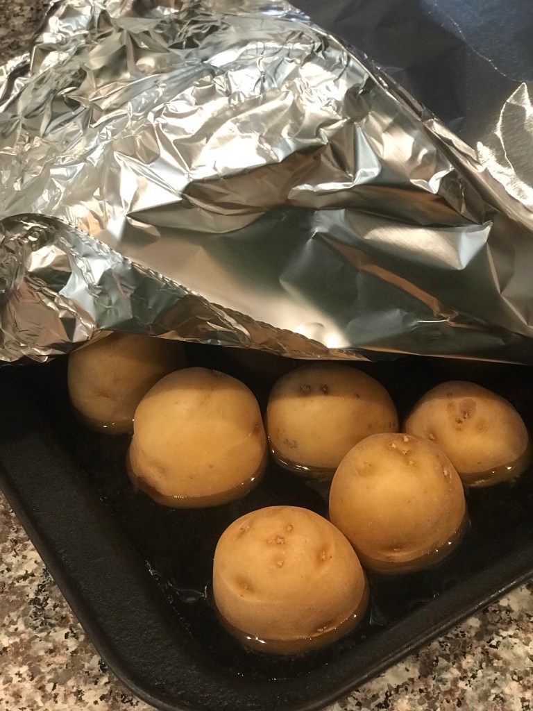 3. Cover tightly with foil. May need to use two overlapping sheets. Seal edges well. The potatoes are going to steam in the oven for about 20-25 minutes.