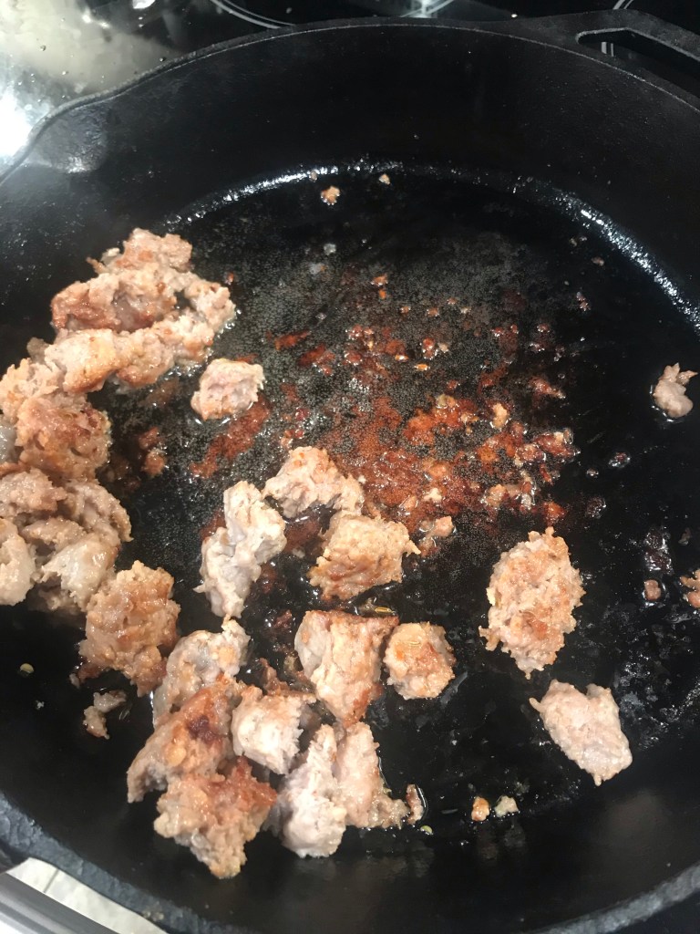 Cooking sausage in cast iron. I ended up moving the sauce to the Dutch oven for simmering, so start with the Dutch oven for less mess.