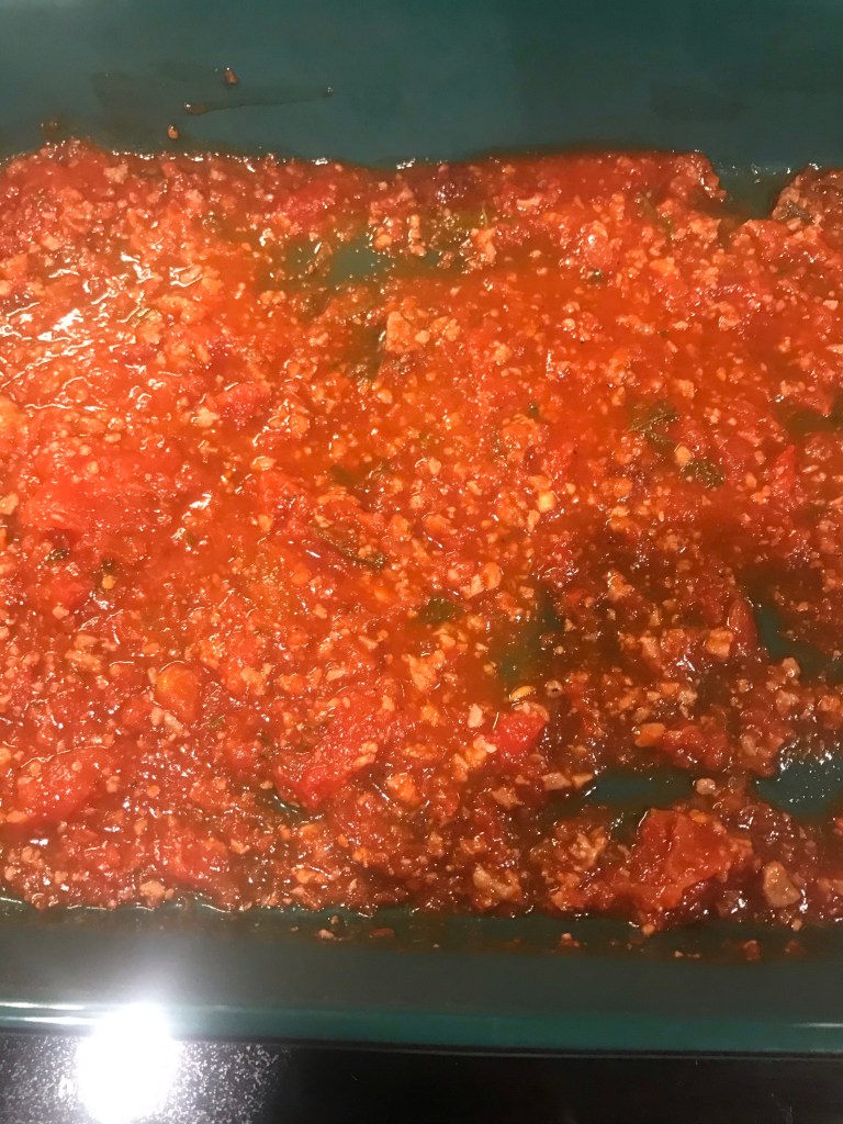 First layer of sauce at bottom of Pan.