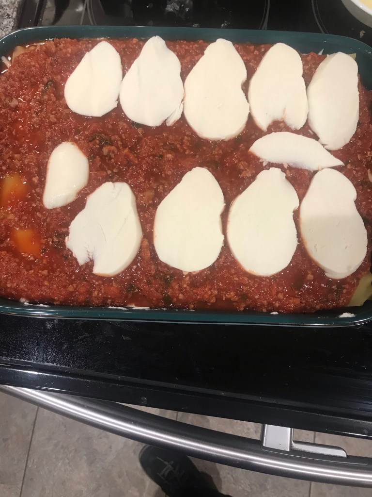 11. Top with another layer of pasta, top with sauce and slices of fresh mozzarella. Cover tightly with foil and bake one hour in a 375f oven (no fan).