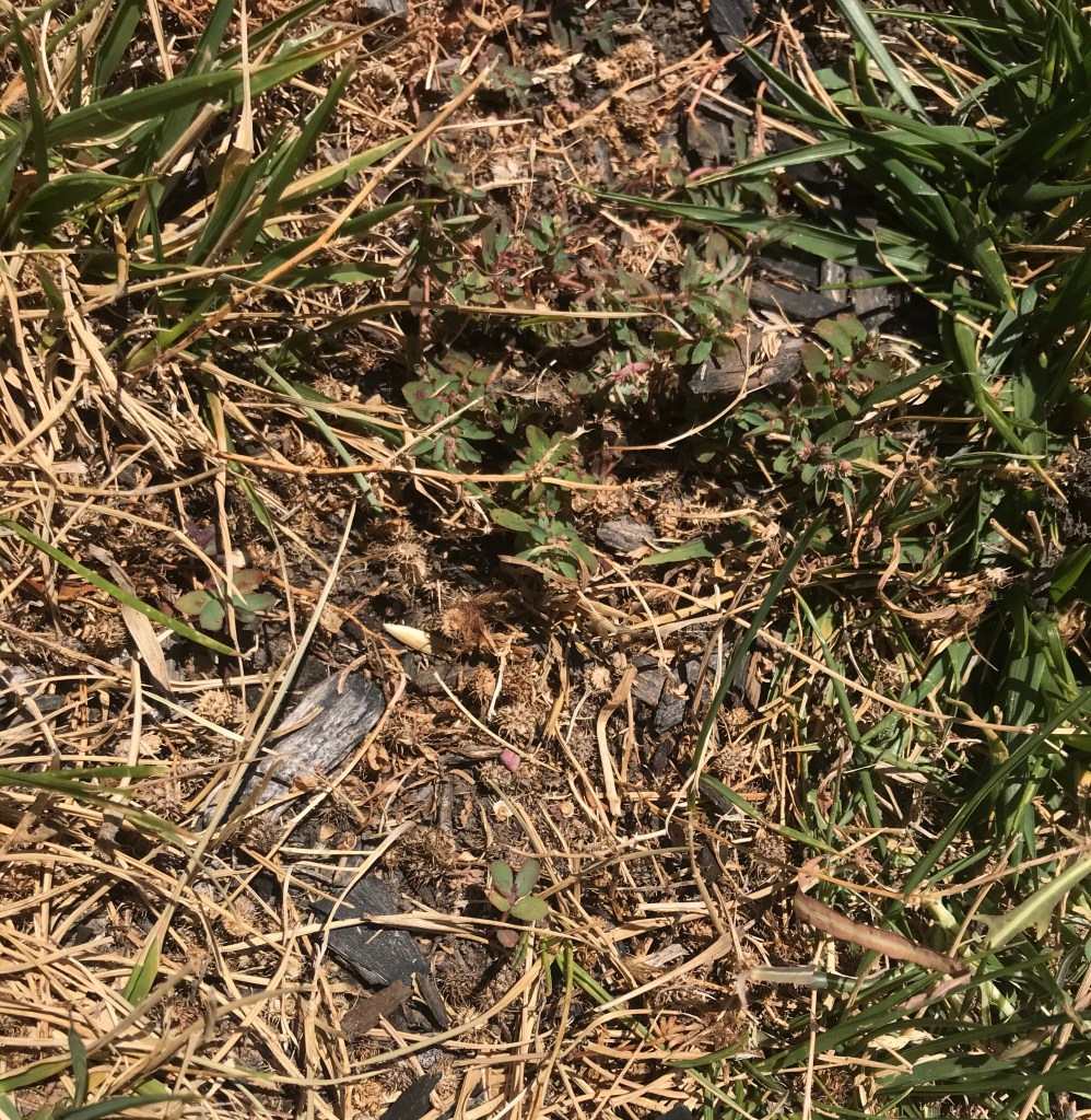 Pick a day when your green yard waste bin is empty or close to it. Lay an old towel or blanket on the latch with the burrs. Gently press the towel into the burr patch. Gently pull it up. Fold, and carry to your green yard waste bin and shake the towel. Most of the burrs will fall off. Repeat. This is time consuming, so be prepared. The pictures below show a third pass with the towel. it won’t pick up ALL of them but it’s making the yard more manageable.