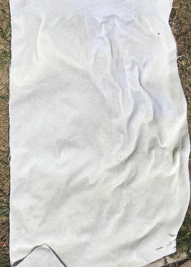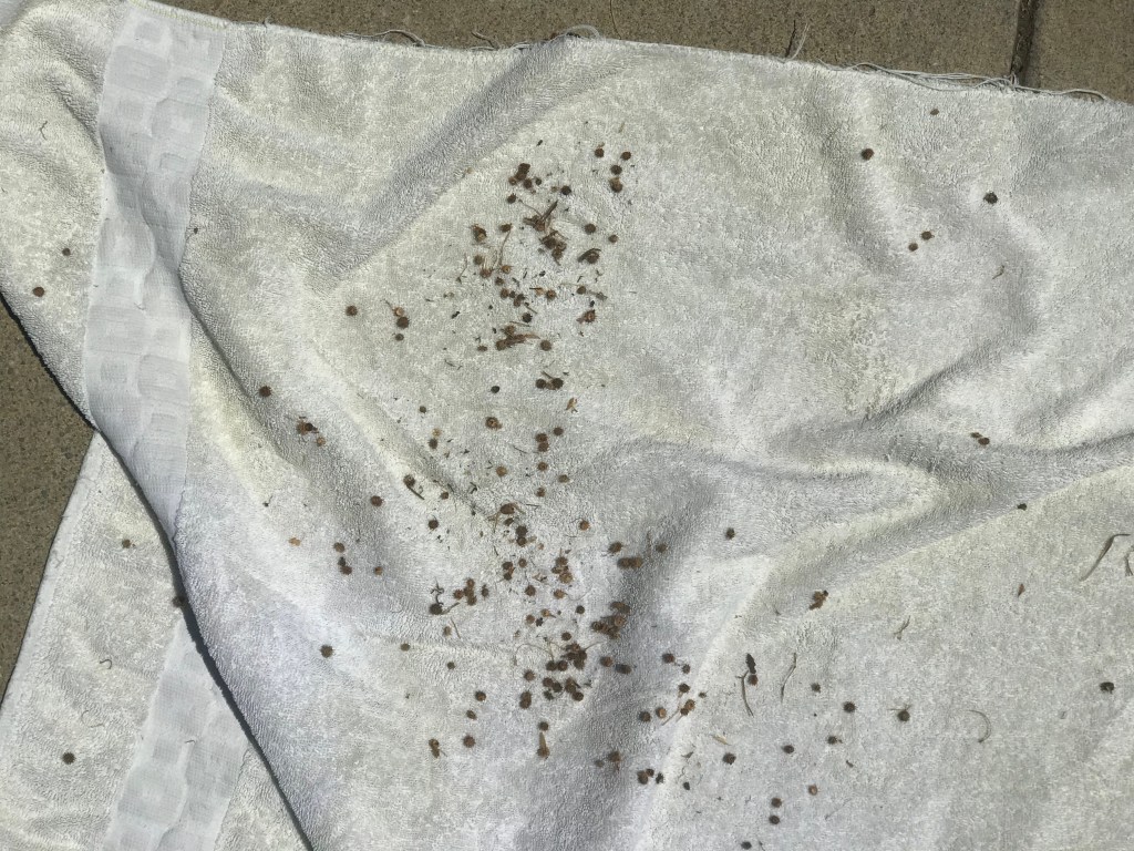 I can pull the burr medic that is already there, I need to remove the burrs from the ground so I make sure the grass seed can touch the dirt. If I had a shop vac, I’d vacuum them up, but I don’t, so I did the next best thing. Use an old towel.