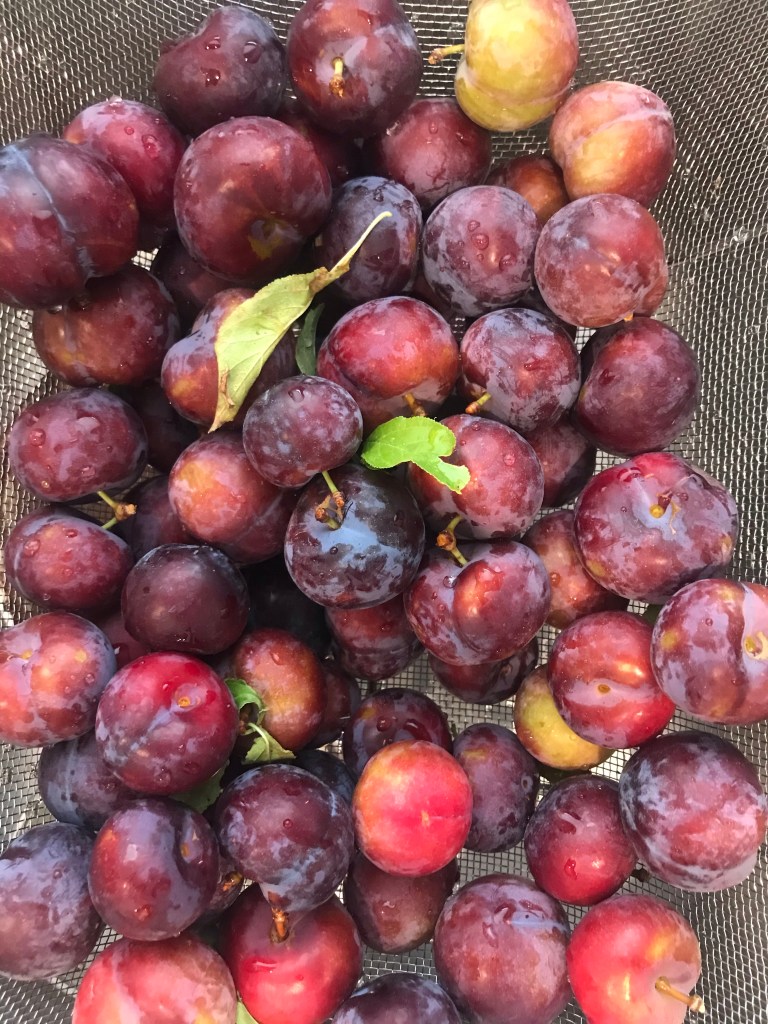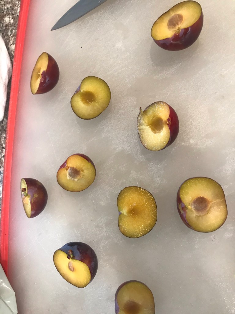 To slice, I ran a knife around the plum’s indentation and then twisted the plum apart. Sliced the seedless half and then sliced around the seed.