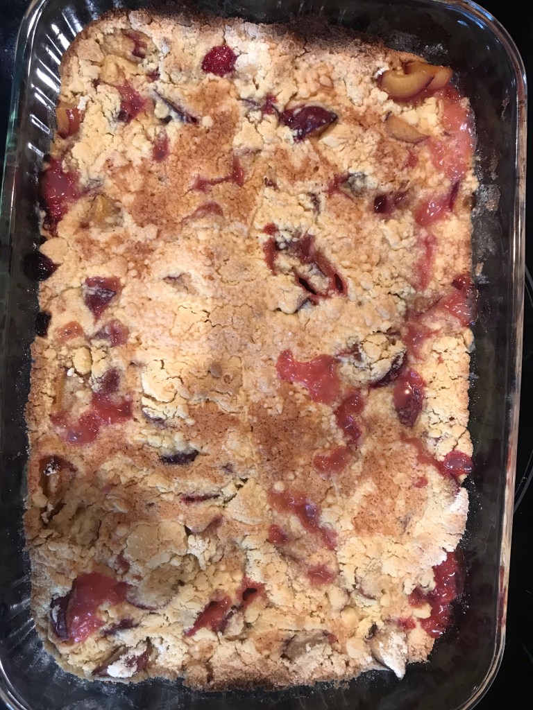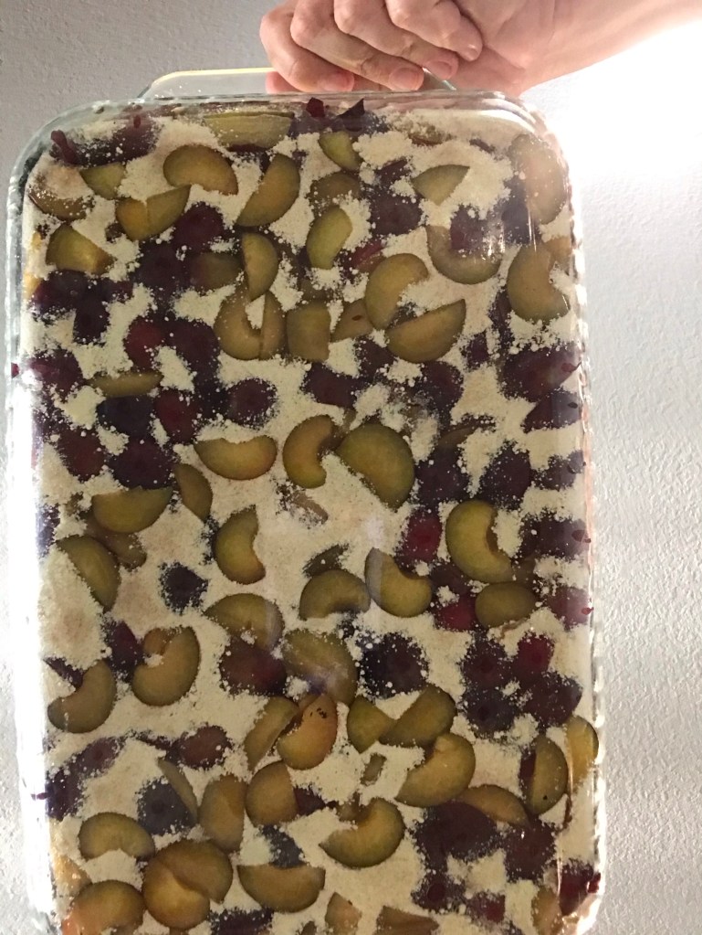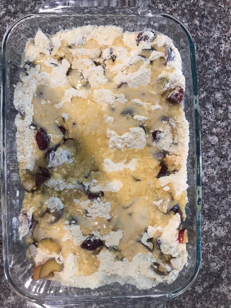 Our new house has a plum treeBottom view of plums with cake mix and butter on top. Top view before bakingTop view after bakingPlum cake