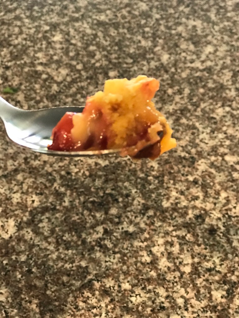 The plums have such a sour skin, but the flesh is sweet plus the sweetness of the cake mix led me to add no sugar to the fruit. You can add cinnamon, but I like tasting the plums as is.
