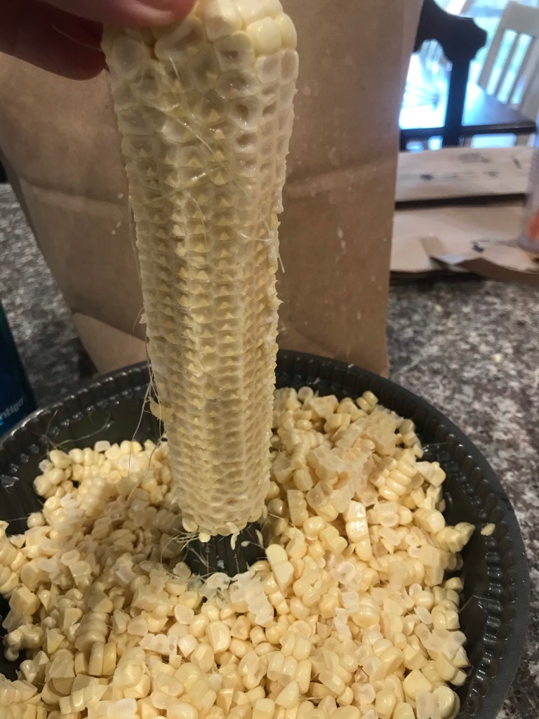 Cut corn from cob. Using a bundt pan, place end of corn on center piece and cut corn so that it falls in the bundt pan. Using dull side of knife, scrape the con to extract the corn “milk.” (Corn milk is optional). Repeat until all corn is cut from cob.