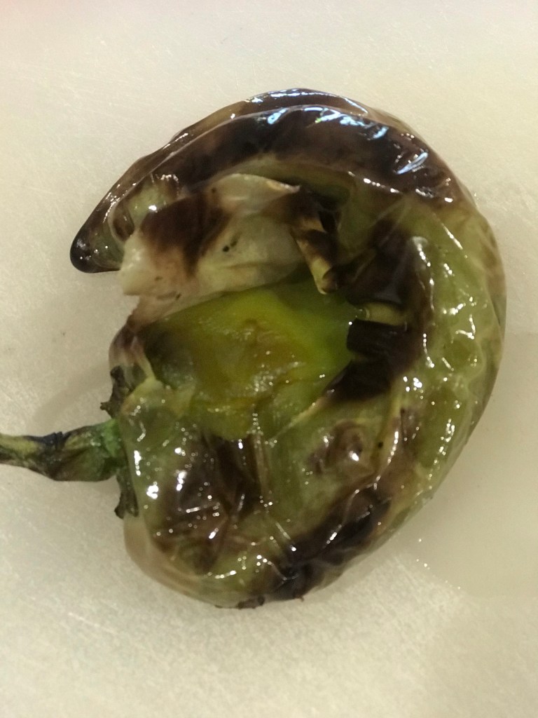 Roast on gas grill set to high. Turning so the are equally charred in all sides. If no gas grill, broil on high, but keep an eye on them and turn until charred in all sides. Place in bowl & cover with plate.