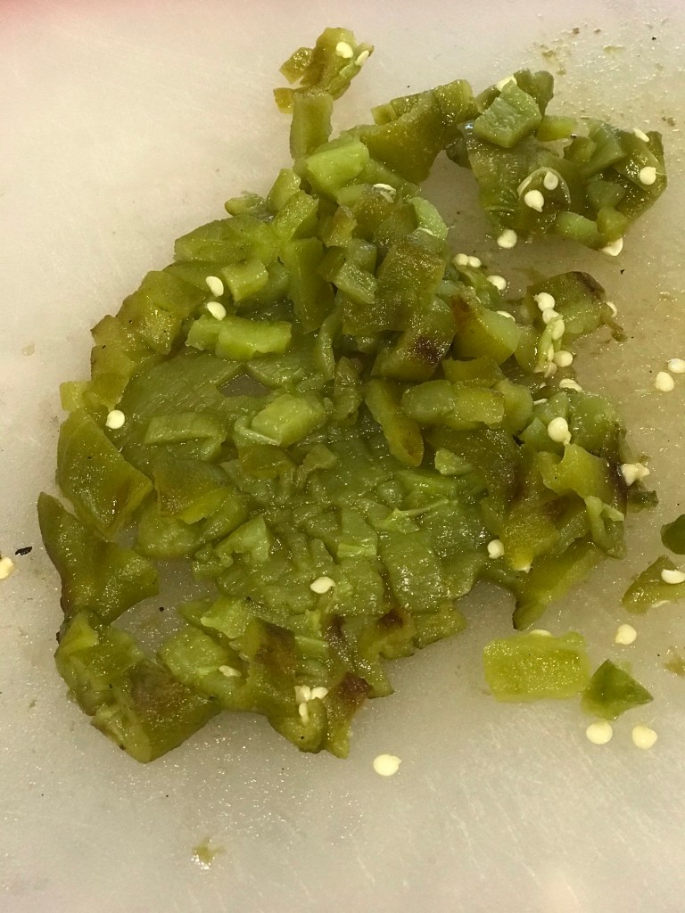 Take chilies out of brown and scrape skin off with a knife & discard. Dice peppers & add to skillet. Mix well & turn up heat to high.