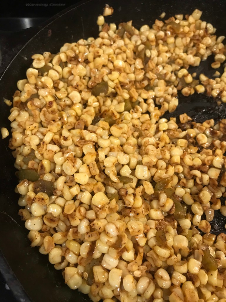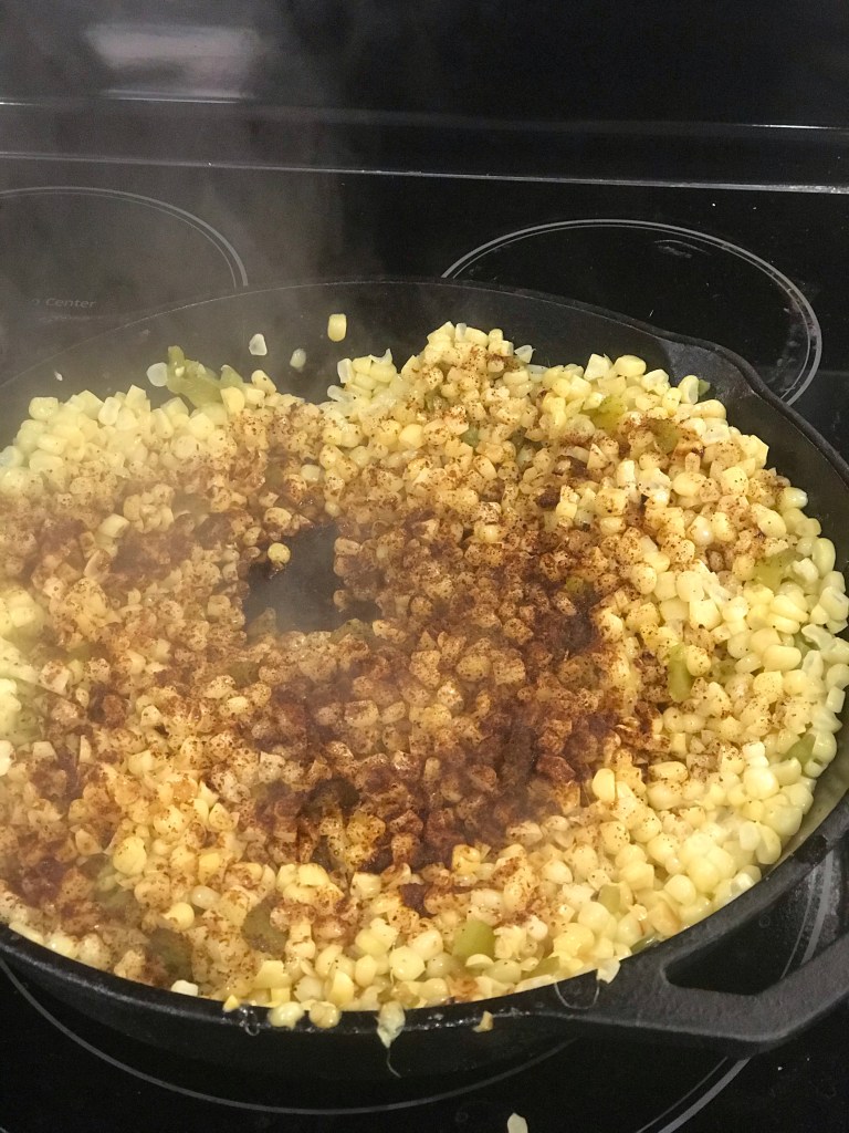 Put butter in 12” cast iron skillet or other 12” skillet. Melt butter on medium high heat. Add corn.