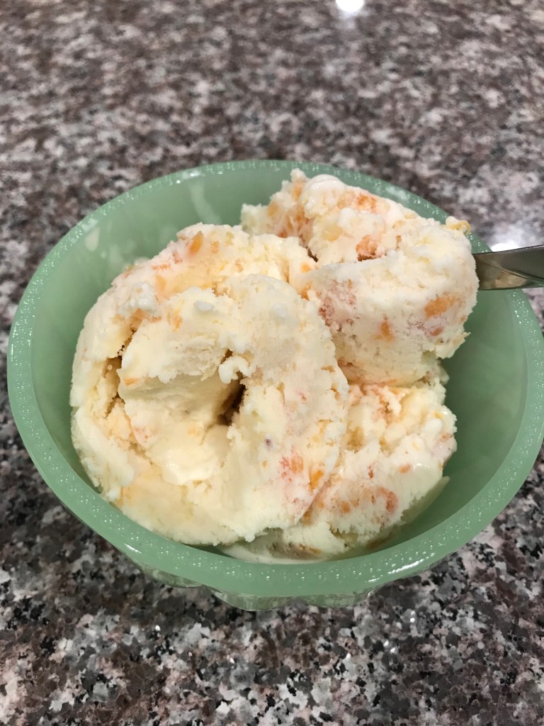 Add peaches & stir 30 seconds. Transfer to airtight container. Freeze until hard (4 hours or more)