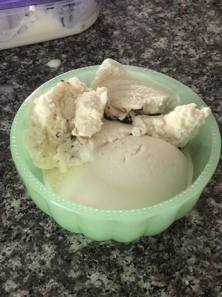 Freeze in ice cream maker until soft serve texture. Transfer to air right container and freeze until hard.